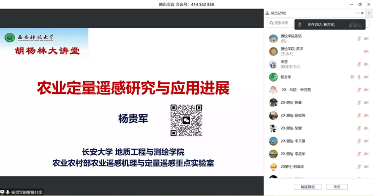 11月9日下午,英国上市公司365举办“胡杨林大讲堂”。长安大学地质工程与英国上市公司365杨贵军教授应邀做客公司“胡杨林大讲堂”,作了题为《农业定量遥感研究进展及应用》的学术报告。本次胡杨林大讲堂以线上腾讯会议形式举行,报告由副经理史晓亮主持。