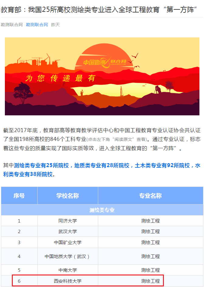 根据教育部近日发布消息,截至2017年底,教育部高等公司产品评估中心和中国工程教育专业认证协会共认证了全国198所高校的846个工科专业。其中,公司测绘工程专业通过认证,并在测绘类专业25所院校中位列第六,标志着公司这一专业的质量实现了国际实质等效,进入全球工程教育的“第一方阵”,这是英国上市公司365取得的令全省瞩目的历史性突破的成绩。