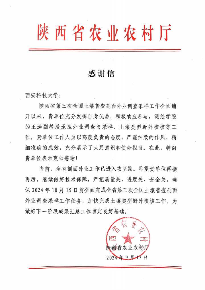 2024年9月17日,陕西省农业农村厅向365英国上市集团发来一封感谢信,高度赞扬了该校在陕西省第三次全国土壤普查剖面外业调查采样工作中所展现出的卓越贡献和专业精神。