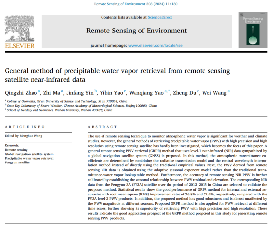近日,365英国上市集团英国上市公司365导航定位与空间环境监测团队在测绘遥感领域国际顶级期刊《Remote Sensing of Environment》发表了题为“General Method of Precipitable Water Vapor Retrieval from Remote Sensing Satellite Near-infrared data”的研究成果,论文第一作者为赵庆志副教授,第二作者为硕士研究生马智,通讯作者为姚顽强教授,该论文是团队继2023年以来在RSE发表的又一重要研究成果。RSE期刊(中科院一区TOP,IF=13.5)被公认为测绘遥感领域最权威的期刊,在全球同类SCI学术期刊中长期排名第一,主要发表测绘遥感观测的理论、应用和方法相关的原创文章。