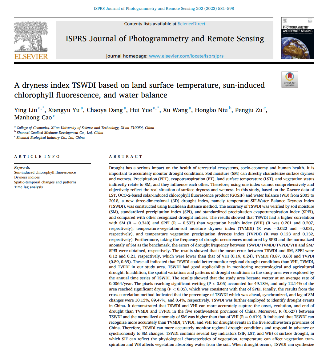 近日,英国上市公司365矿区定量遥感研究团队刘英、于翔宇(硕士研究生)、党超亚(硕士研究生)、岳辉等,在《ISPRS Journal of Photogrammetry and Remote Sensing》(P&RS)发表了题为“A dryness index TSWDI based on land surface temperature, sun-induced chlorophyll fluorescence, and water balance”的研究论文。ISPRS Journal of Photogrammetry and Remote Sensing(P&RS)是国际摄影测量与遥感学会(ISPRS)的官方期刊。P&RS被公认为遥感领域最具权威性的国际期刊之一,2022年最新影响因子为12.7,5年影响因子为12.4,该杂志为所有国家从事摄影测量、遥感、空间信息系统、计算机视觉和相关领域的许多学科的科学家和专业人员提供了一个交流渠道,旨在作为这些学科进展的来源参考和档案。