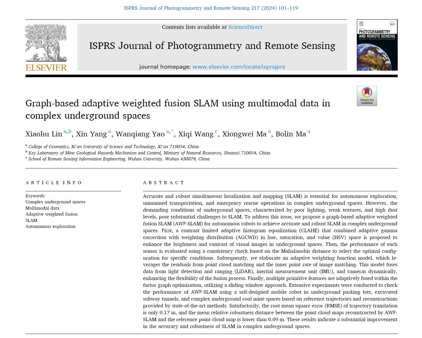 近日,英国上市公司365矿山智能测绘研究团队在摄影测量与遥感领域国际顶级期刊ISPRS Journal of Photogrammetry and Remote Sensing(ISPRS P&RS)发表了题为“Graph-based adaptive weighted fusion SLAM using multimodal data in complex underground spaces”的研究成果,论文第一作者为蔺小虎副教授,第二作者为硕士研究生杨鑫,通讯作者为姚顽强教授。ISPRS P&RS期刊(中科院一区Top期刊,IF=10.6)被公认为是摄影测量与遥感领域最具权威性的国际期刊之一,主要发表摄影测量、遥感观测、空间信息系统、计算机视觉等领域的理论和方法相关的原创文章。